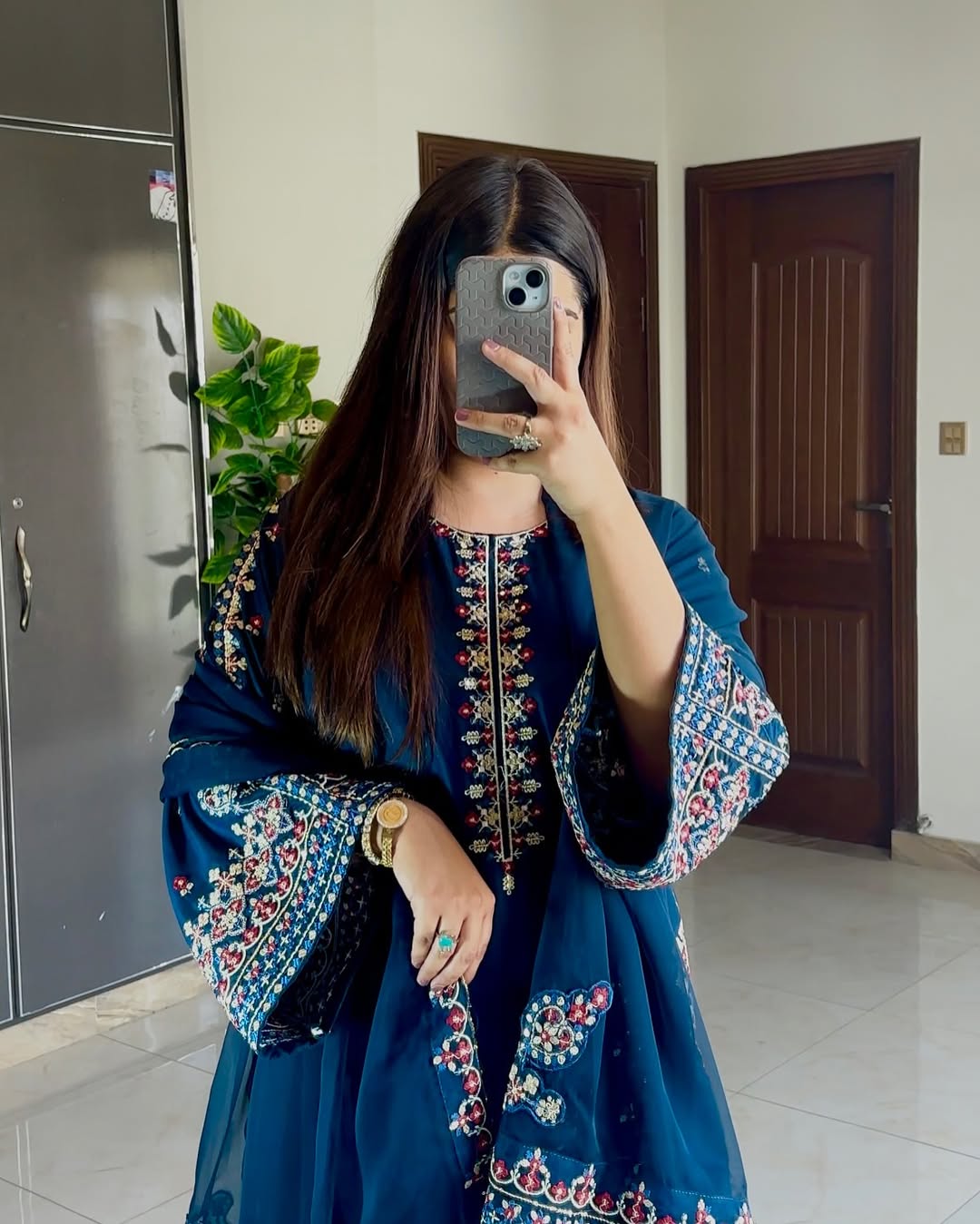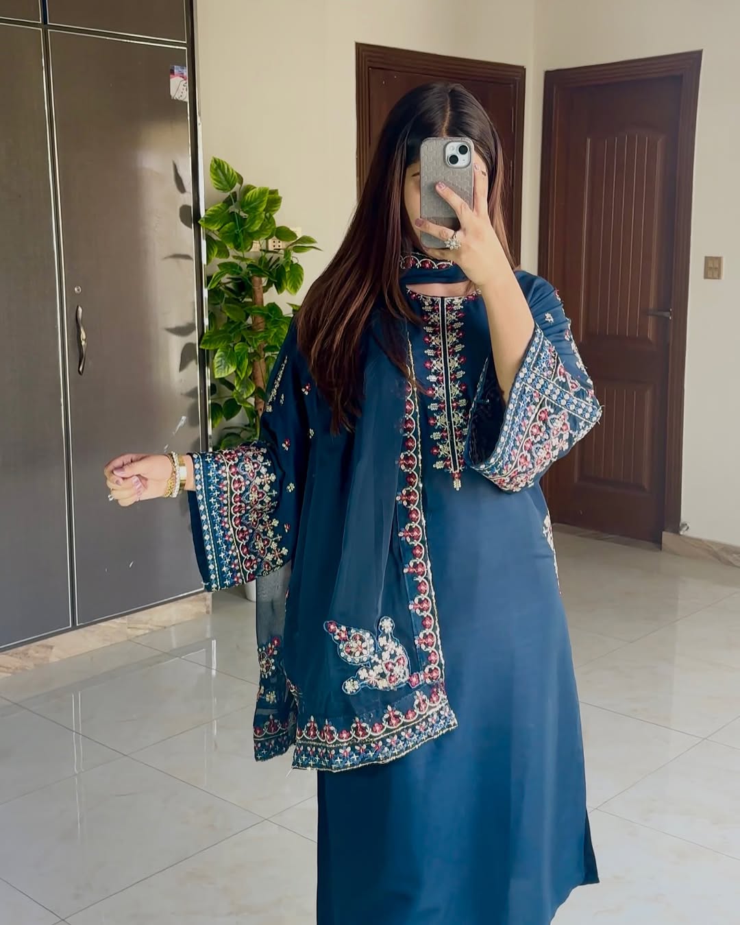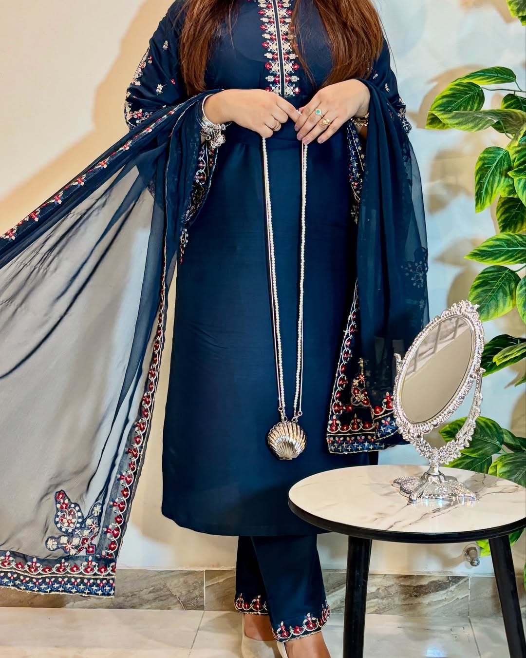 This 3-piece ocean blue kurta set exudes elegance with intricate embroidery on the shirt, loose-fit sleeves, and a crinkle-chiffon dupatta featuring detailed borders. Paired timeless style and modern sophistication.