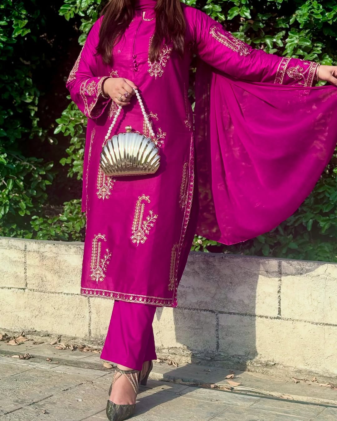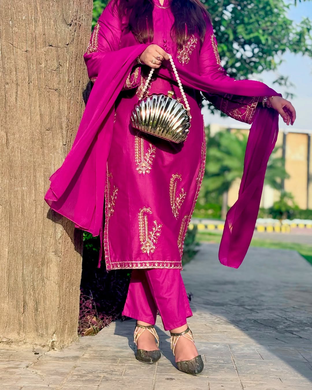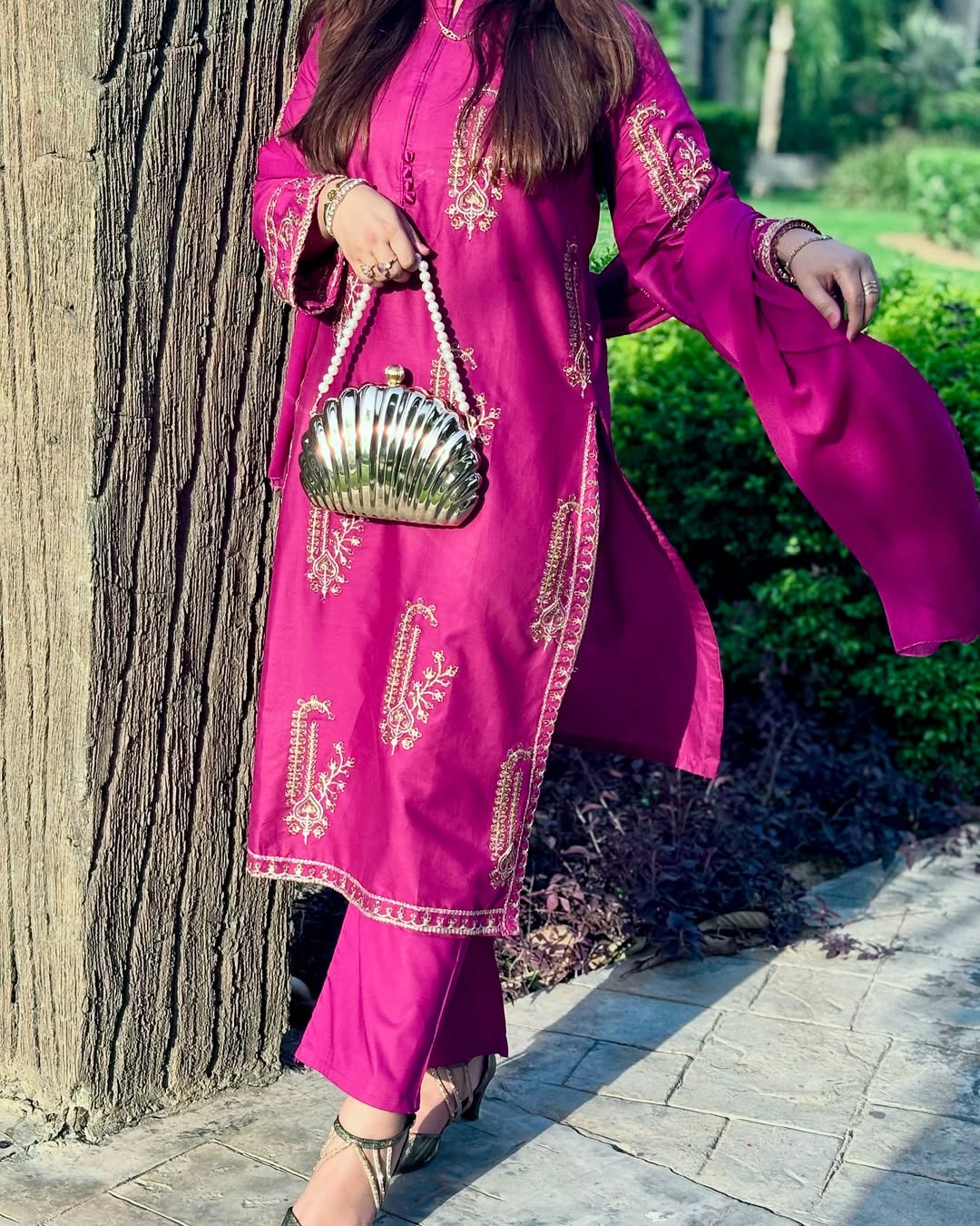 Indulge in luxury with our beautifully embroidered two-piece set in a stunning purple hue. The intricate embroidery adds a touch of elegance to this ensemble.