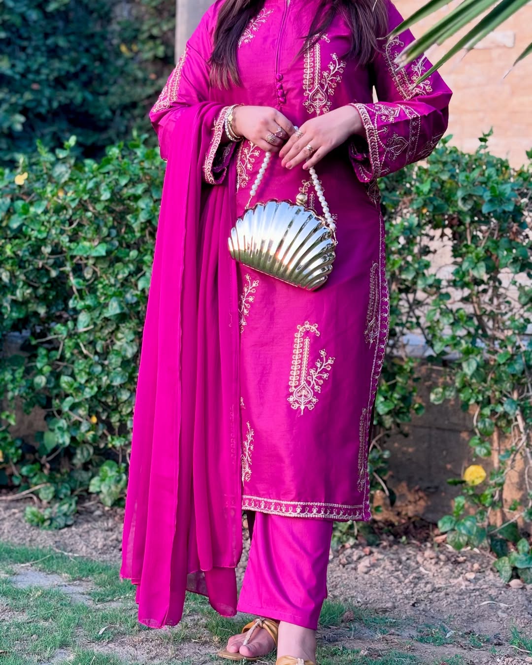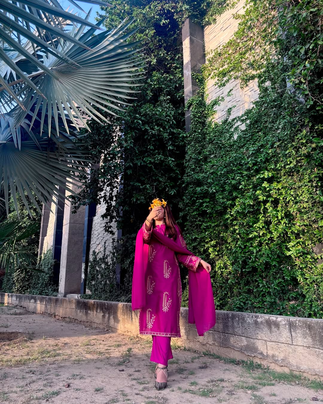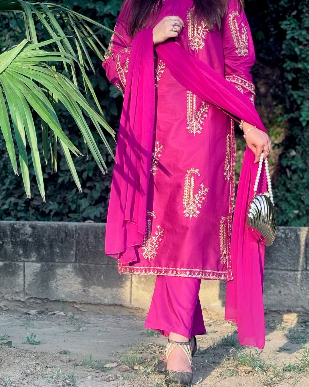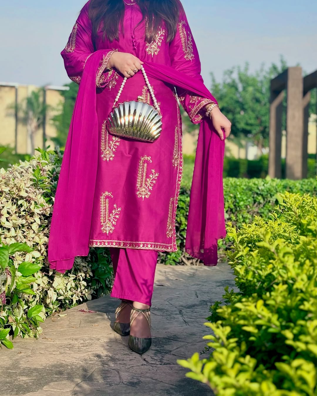 Indulge in luxury with our beautifully embroidered two-piece set in a stunning purple hue. The intricate embroidery adds a touch of elegance to this ensemble.