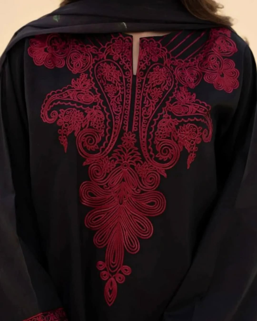 Additional Description: Step into timeless elegance with our “Noir Rouge Charm” 3-piece linen suit, a graceful blend of bold sophistication and delicate charm. The black shirt features intricate maroon embroidery on the neckline, sleeves, and hem, offering a striking contrast that captures attention effortlessly. Paired with matching black trousers adorned with embroidered borders, the outfit reflects understated luxury.